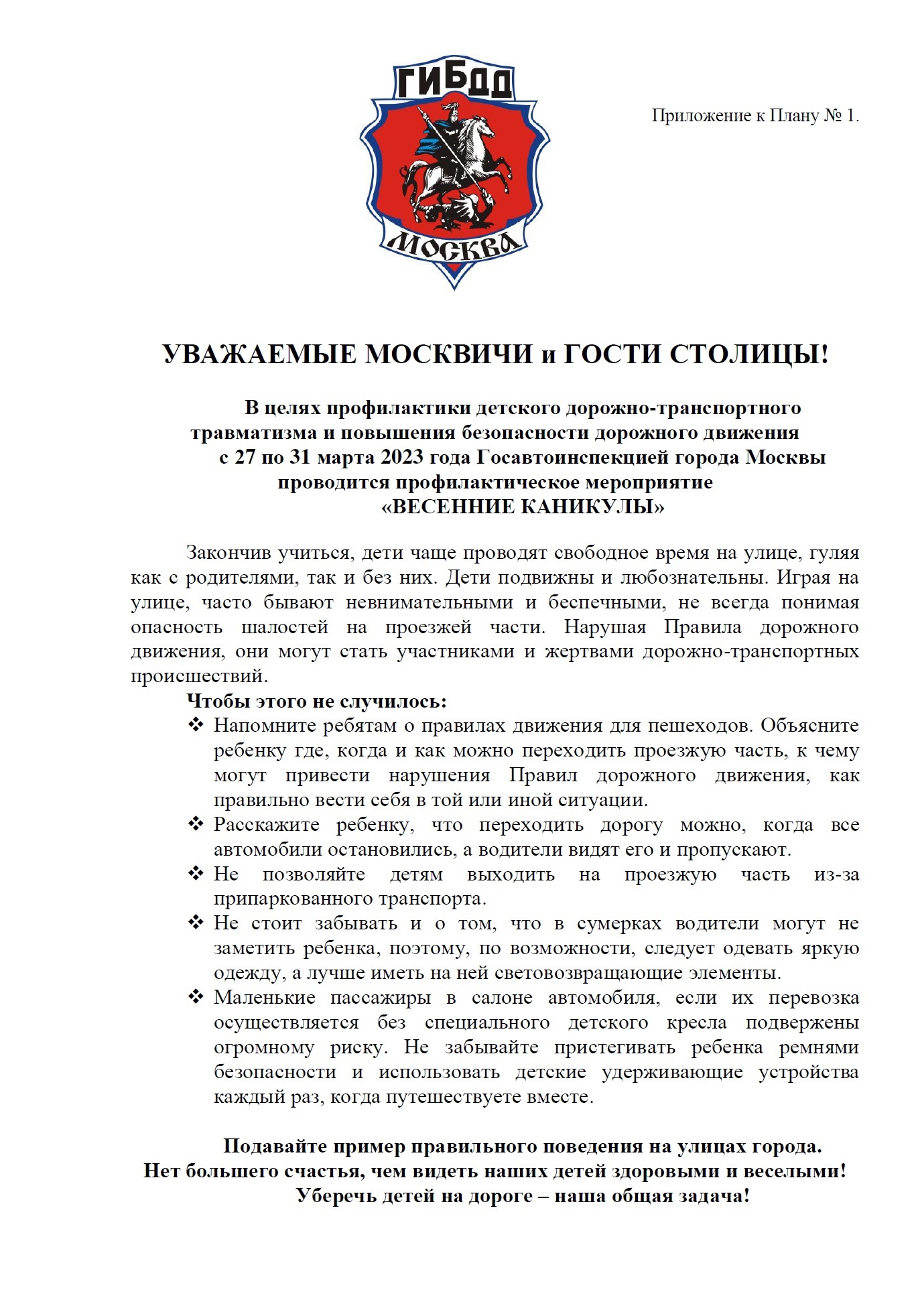 В целях предупреждения детского дорожно-транспортного травматизма в период с 27 по 31 марта 2023 проводится общегородское профилактическое мероприятие «Весенние каникулы».